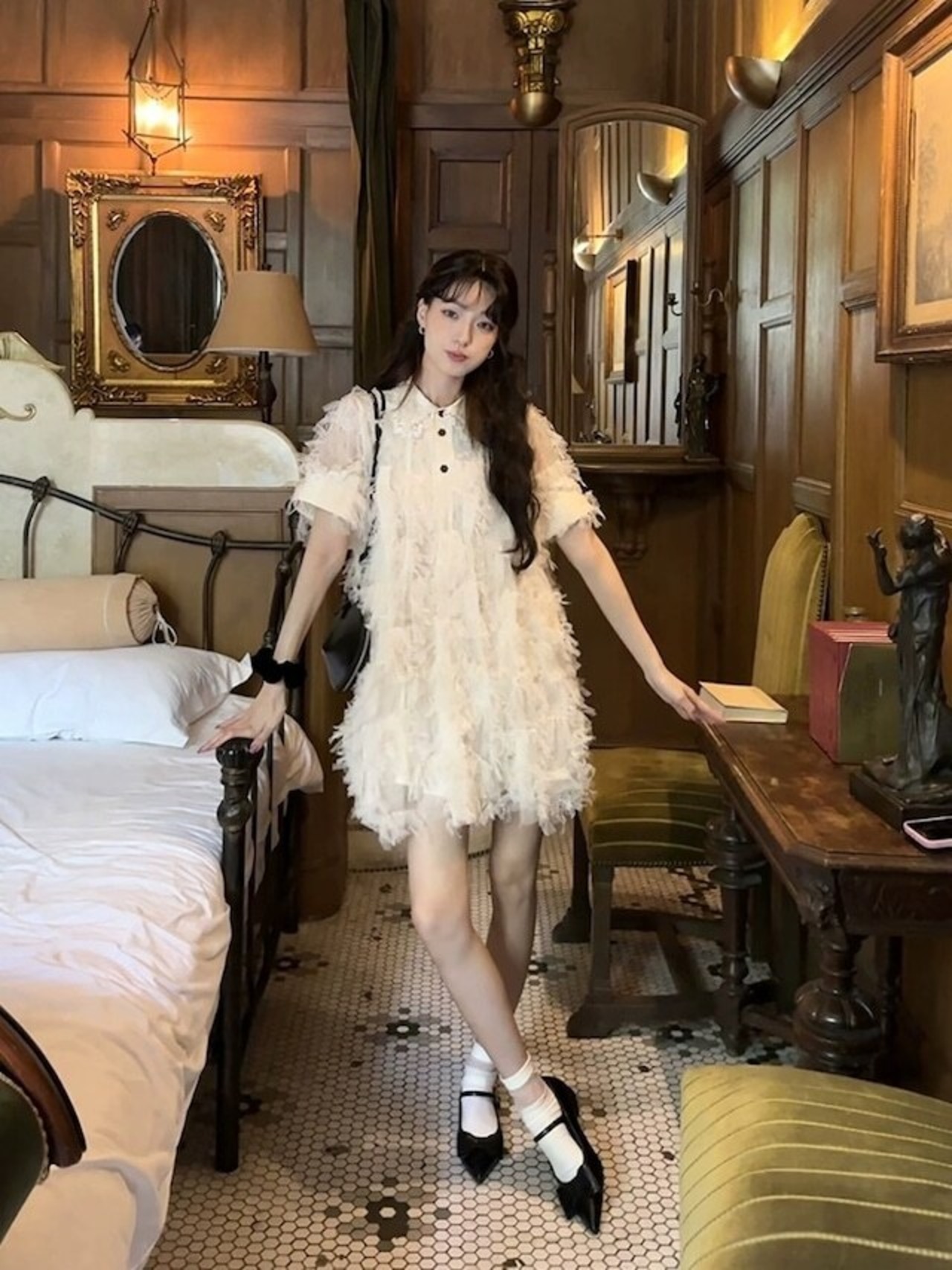 大人可愛いレースシャーリングミニワンピースシャツワンピース メッシュホワイトフレアワンピース
