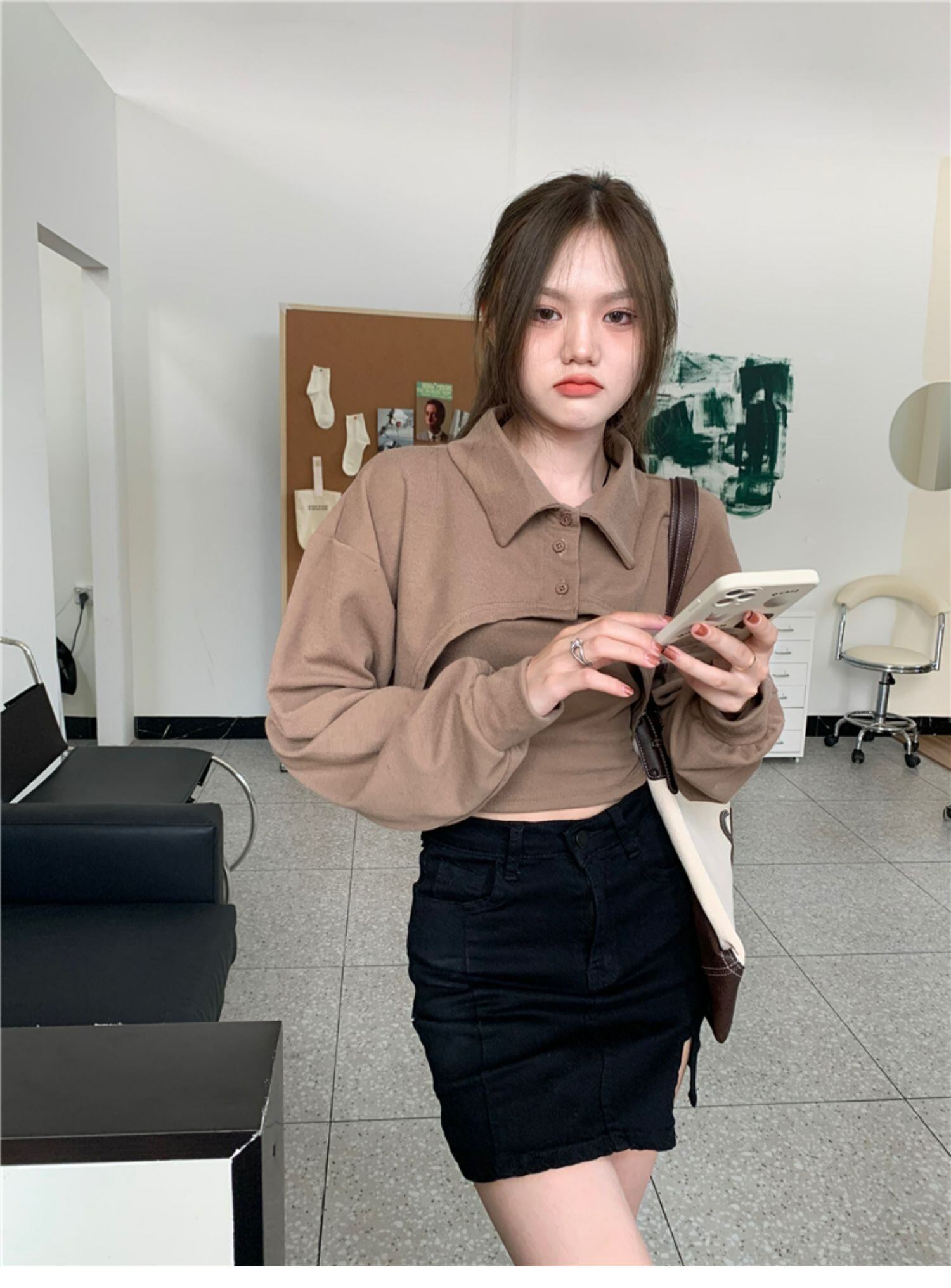 韓国ファッショントレンドオフィスカジュアル無地ユニークレイヤード長袖キャミソールSET ミロボレロクロップドシャツレディース トップス シャツ カジュアル シンプル 普段使い 婦人服 欧米 ショート ポロ カラー ダブル ジッパー ハイウエスト胸元ちらりセクシーおしゃれかわいい スリム アウターブラウス 長袖 T シャツクロップドポロシャツキャミセットアームウォーマーレディース洋服秋秋冬大学生通勤通学厚手人気大人可愛い