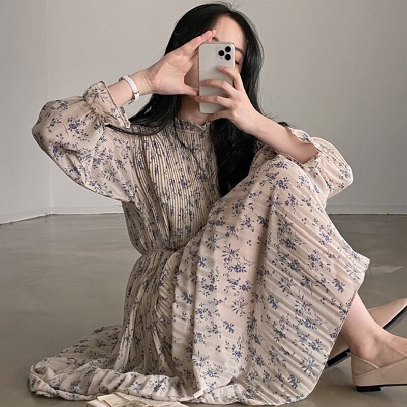 韓国 シャーリング花柄ワンピース Uネック 透け感パフスリーブロングワンピース 長袖