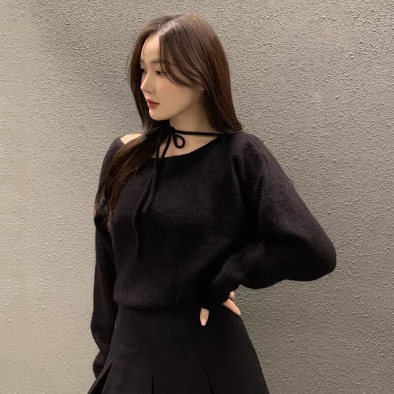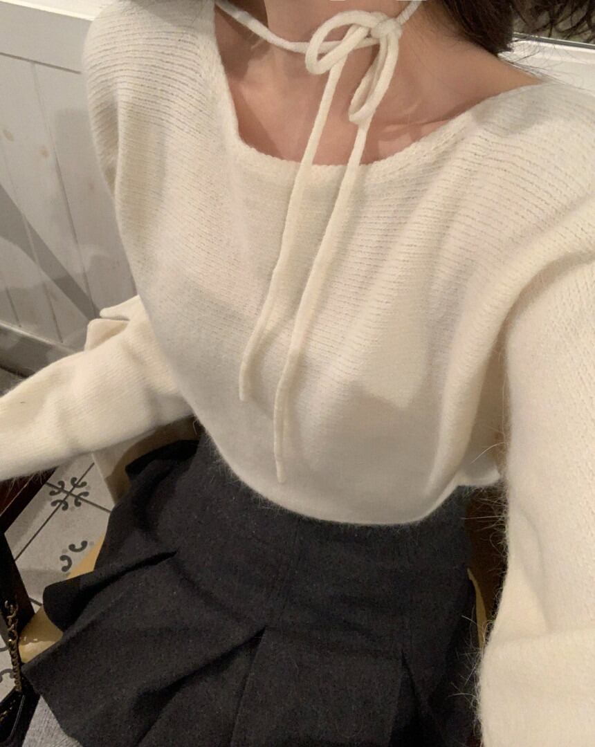 韓国♡ニットトップス セーター ネックリボン 大人コーデ シンプル 長袖秋冬 無地 3色