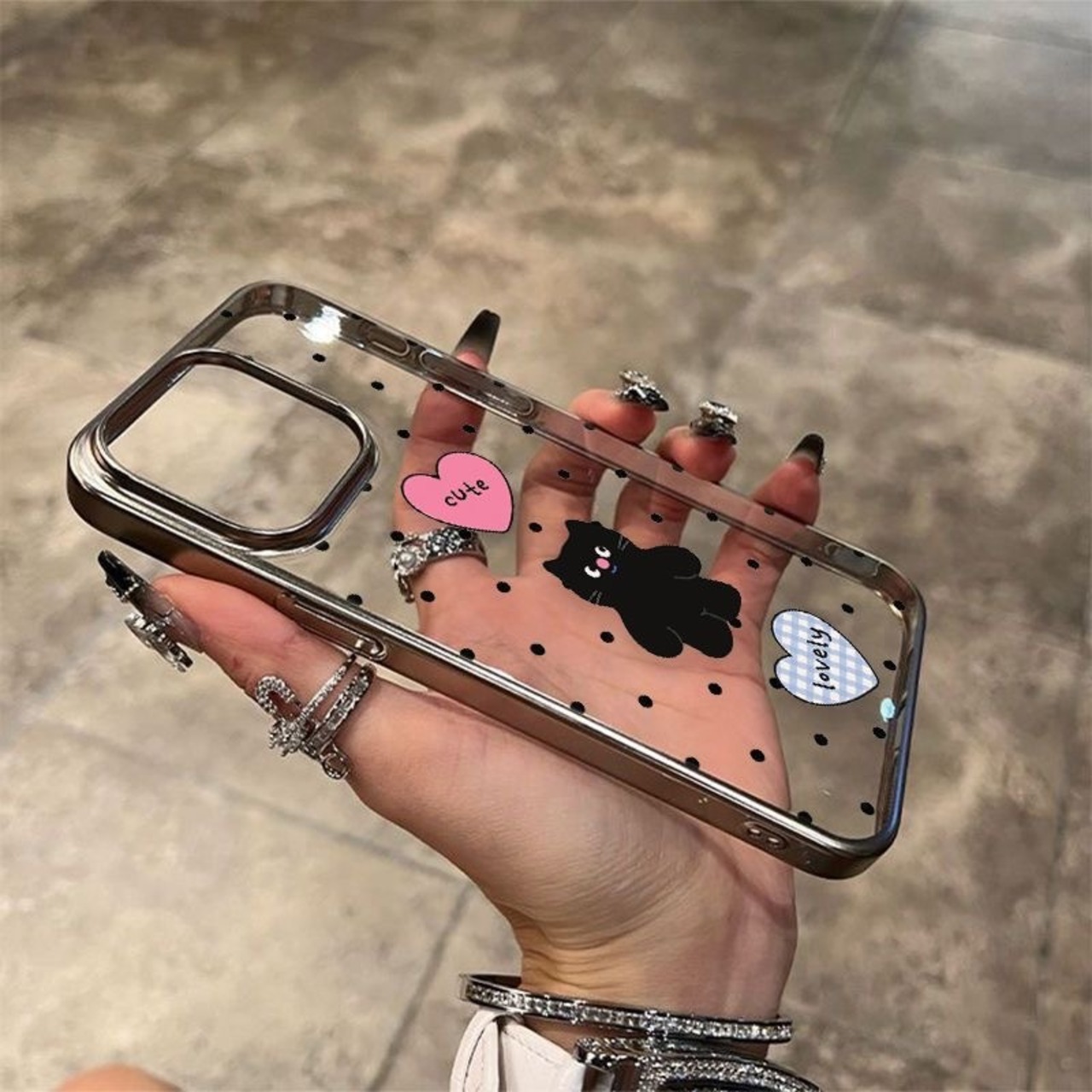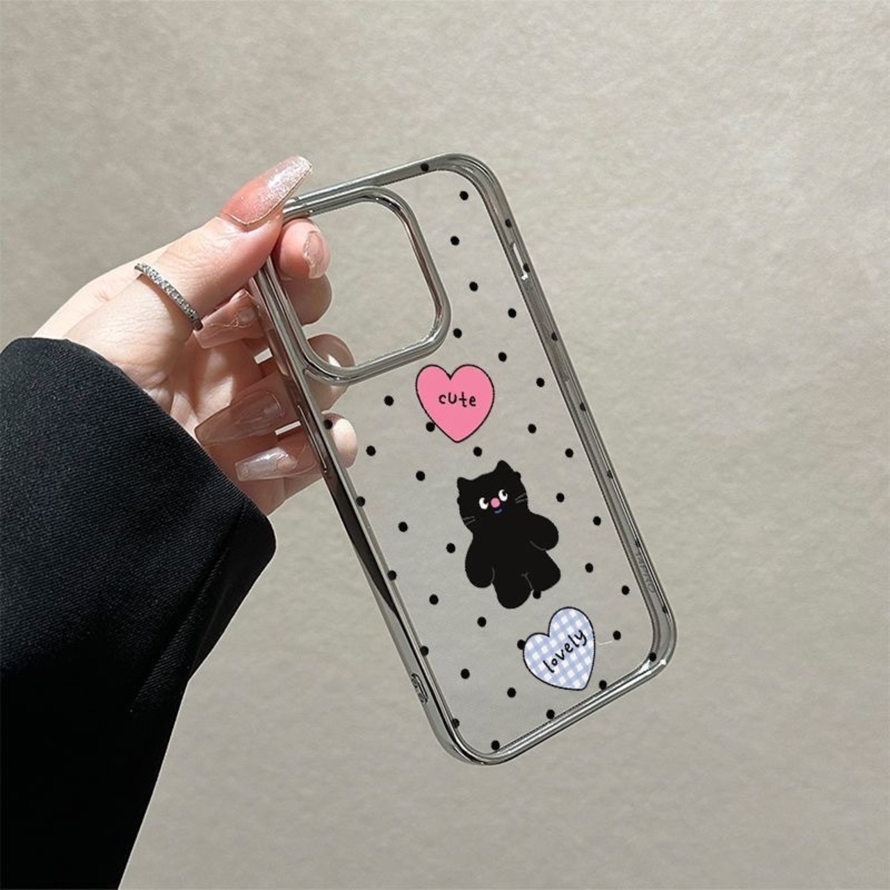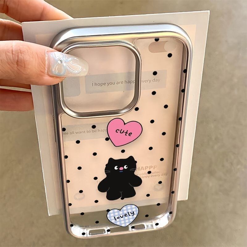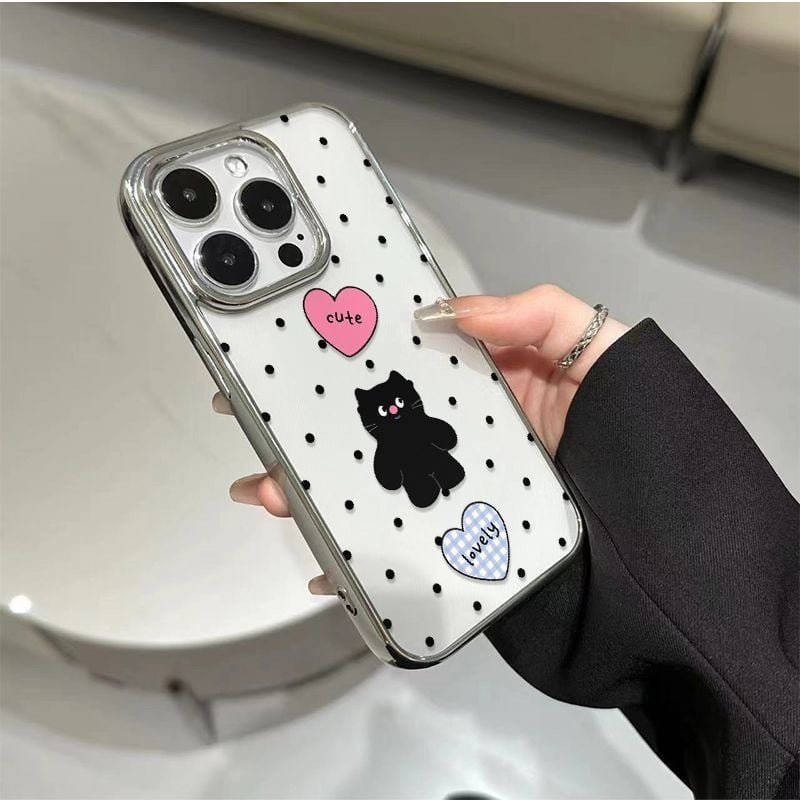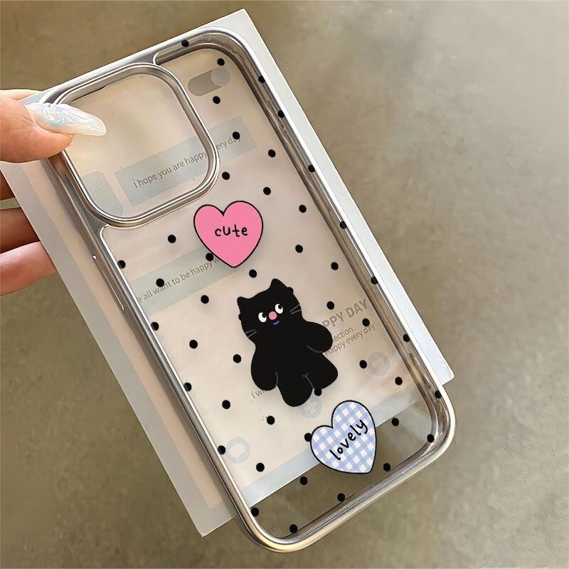 韓国のトレンド、かわいらしいネコちゃんイラストが印象的なiPhoneケースが登場しました!クリアデザインに水玉模様が施されており、あなたのスマートフォンをおしゃれに守るアイテムです♡