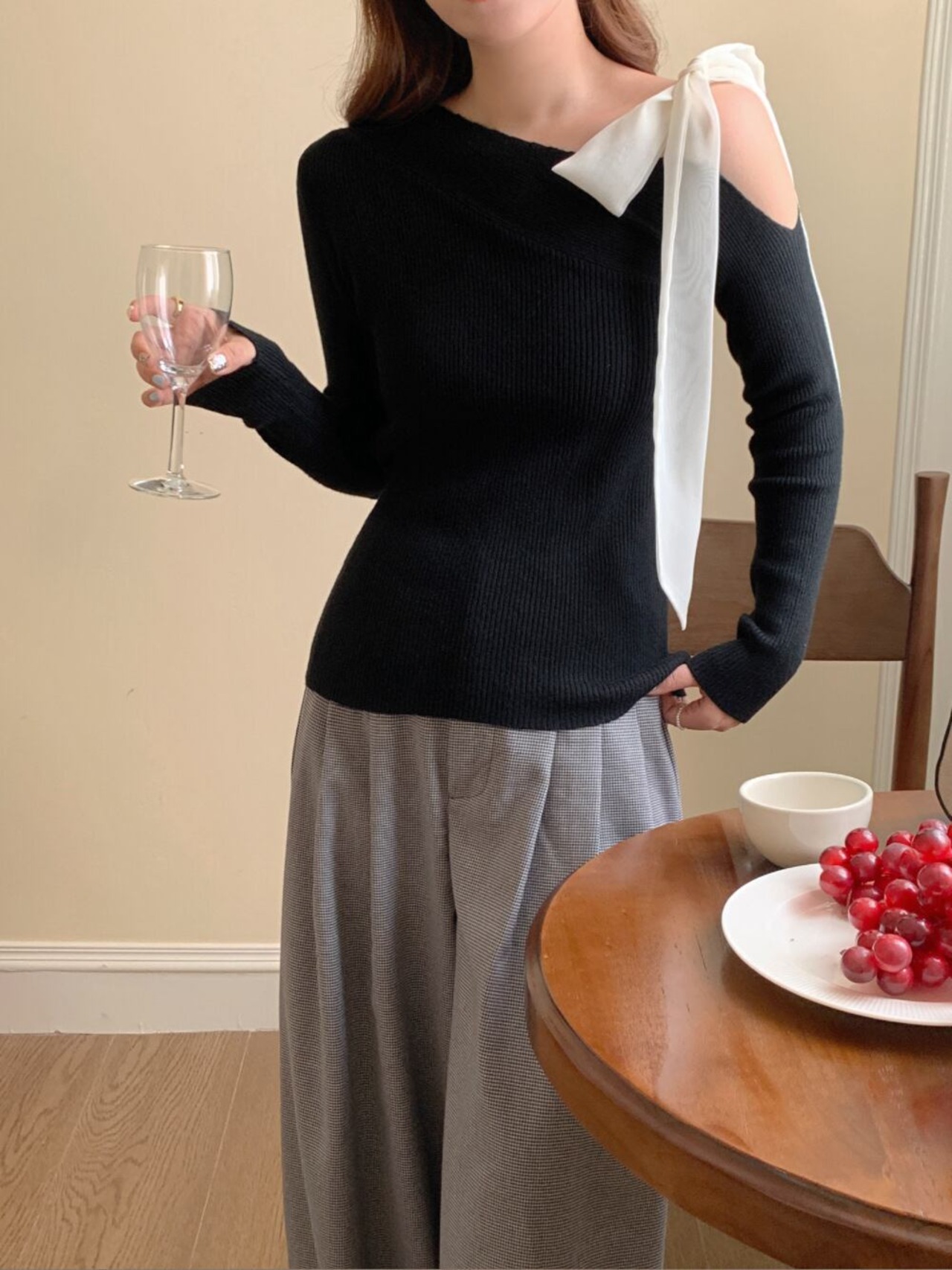 韓国♡オフショルダーリボンニットトップスブラック黒長袖