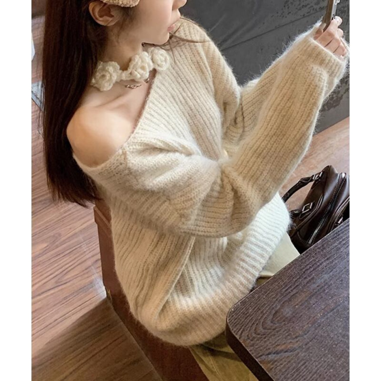 韓国♡フラワーオフショルダーニットトップスセーター長袖2色