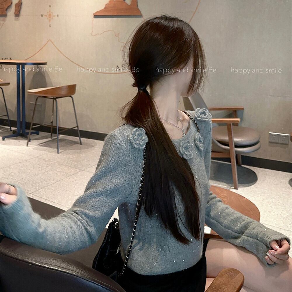 韓国ファッション トレンド カジュアル 秋コーデ 冬コーデ 秋冬コーデ セクシー 大人可愛い おしゃれ ファッション通販 レディース洋服 フラワービジューシャギーニット長袖 レーディス服 女子 セクシー 色気コーデ 色っぽ 大人コーデグレー昭和レトロお花モチーフ花モチーフ付きクロップド丈ニットトップス