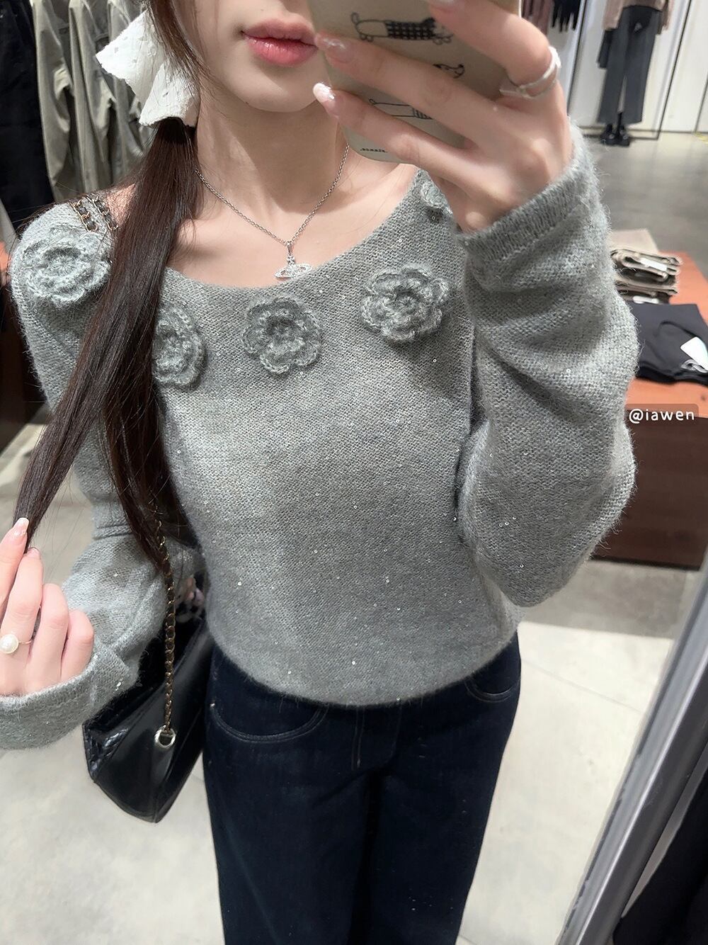 韓国♡上品なスパンコール立体フラワー ラメ入りニットトップス花モチーフ付きグレーおしゃれ大人可愛い
