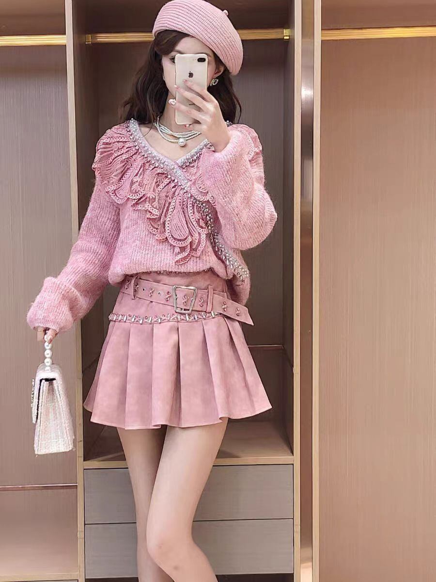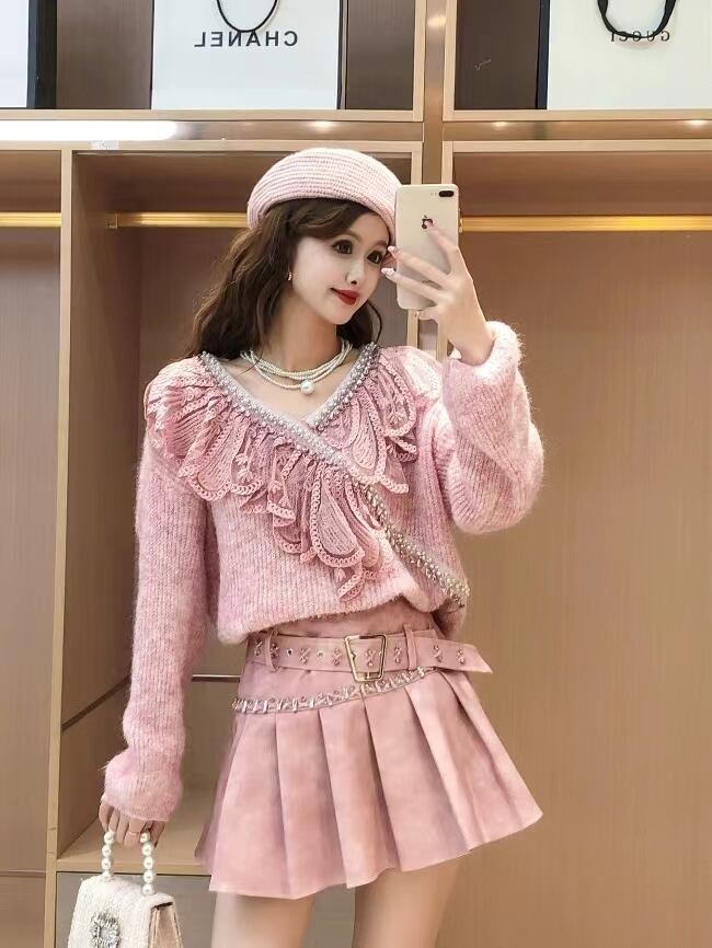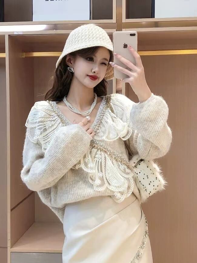 韓国♡派手なVネック レース切り替え ビジューフリルニットトップス長袖セーターおしゃれ 可愛い 3色