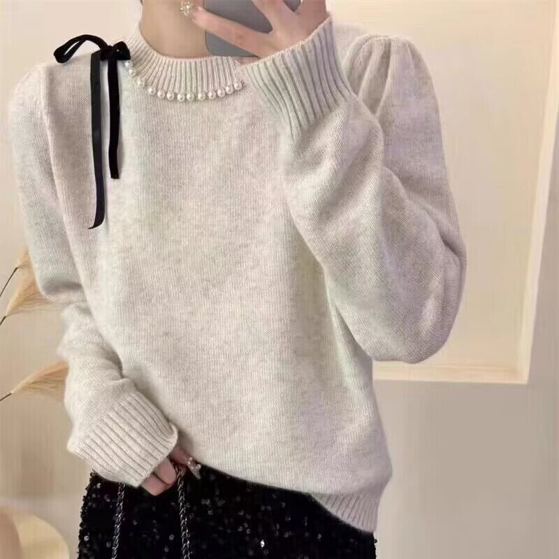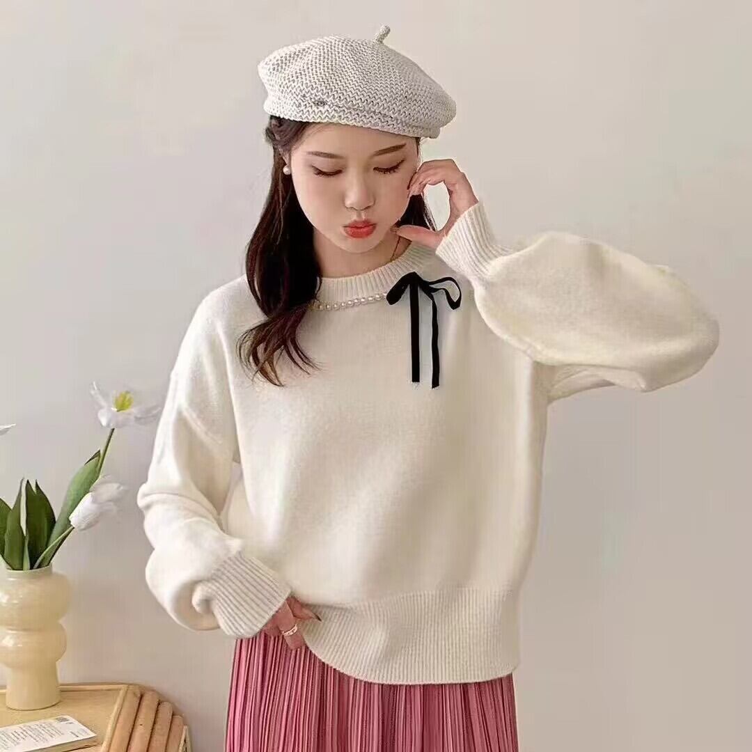 韓国♡ニットトップス長袖パールブラックリボンおしゃれセーター無地 5色