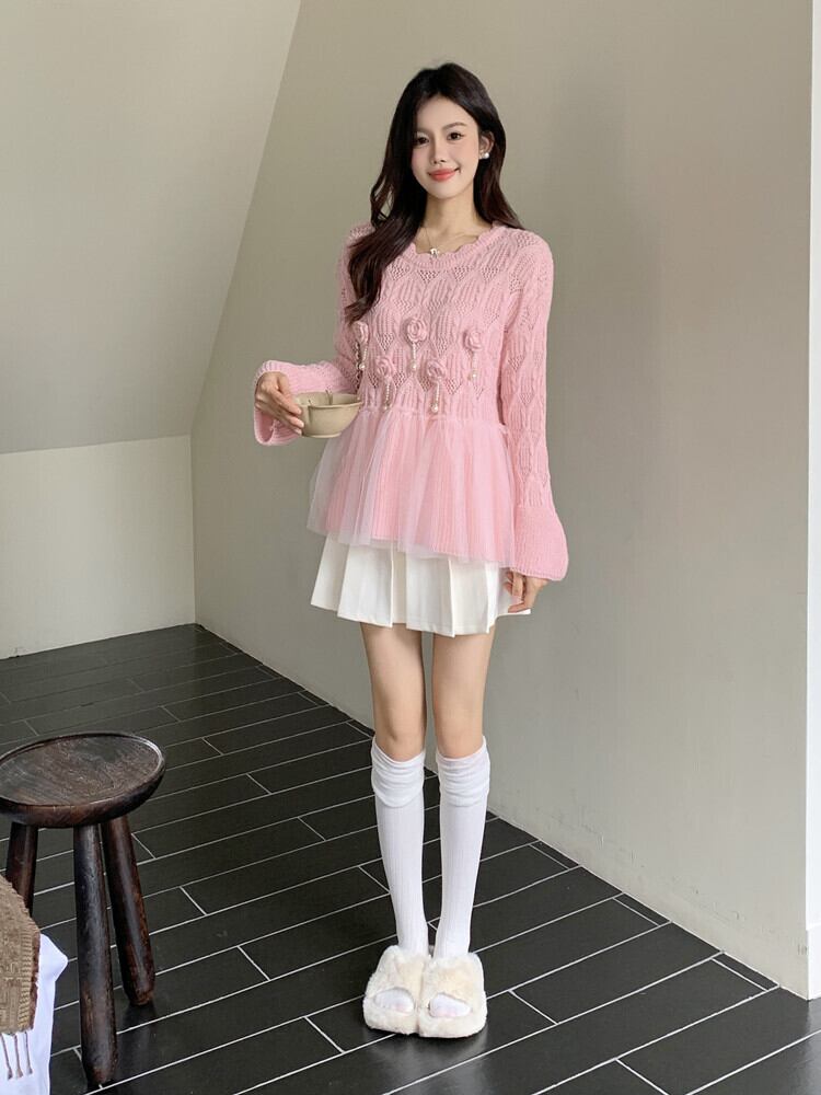 韓国♡立体フラワーモチーフシースルーレースニットトップスセーターチュールおしゃれパール長袖2色