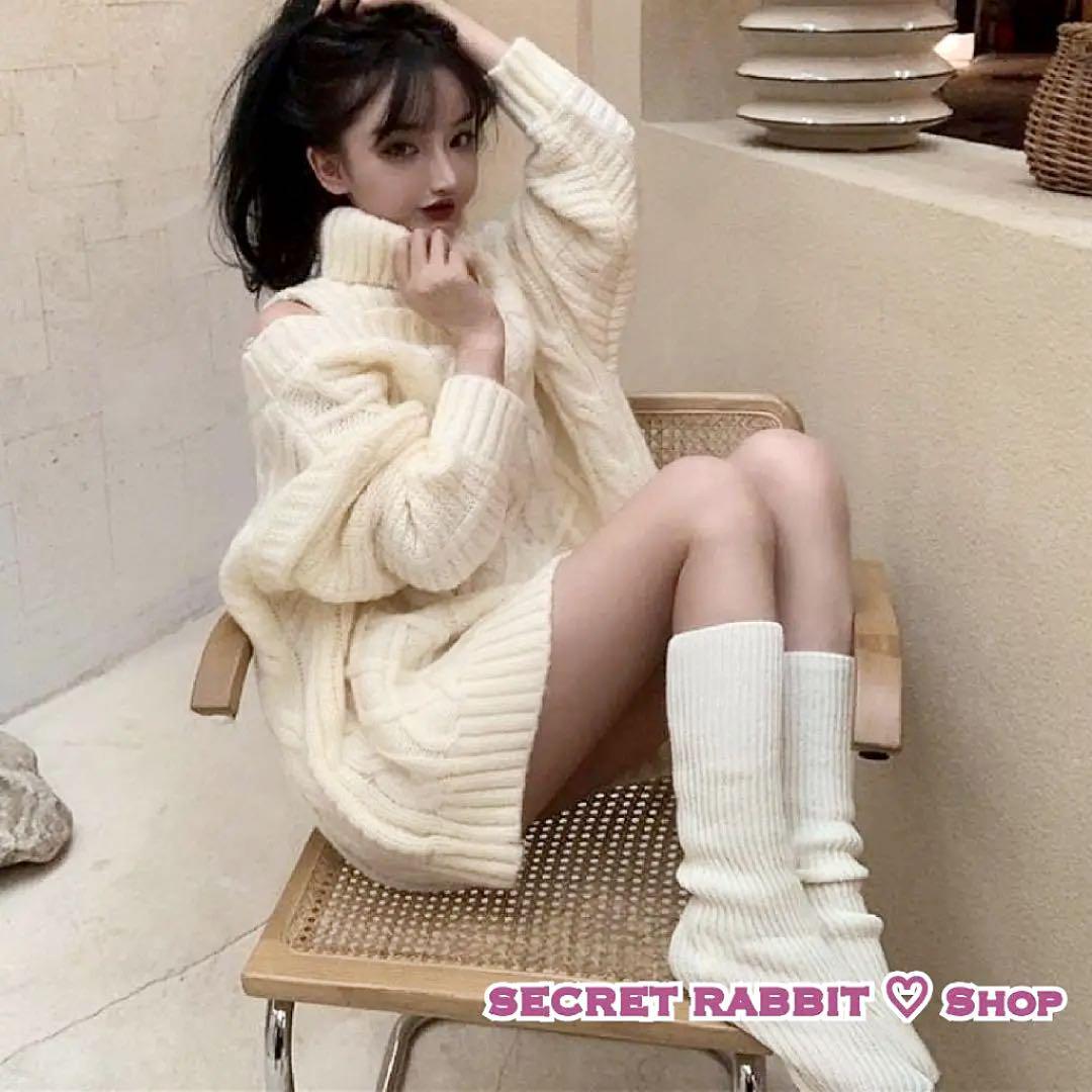 韓国♡タートルネック オープンショルダー オフショル プルオーバー ニット ワンピース秋冬長袖カジュアル